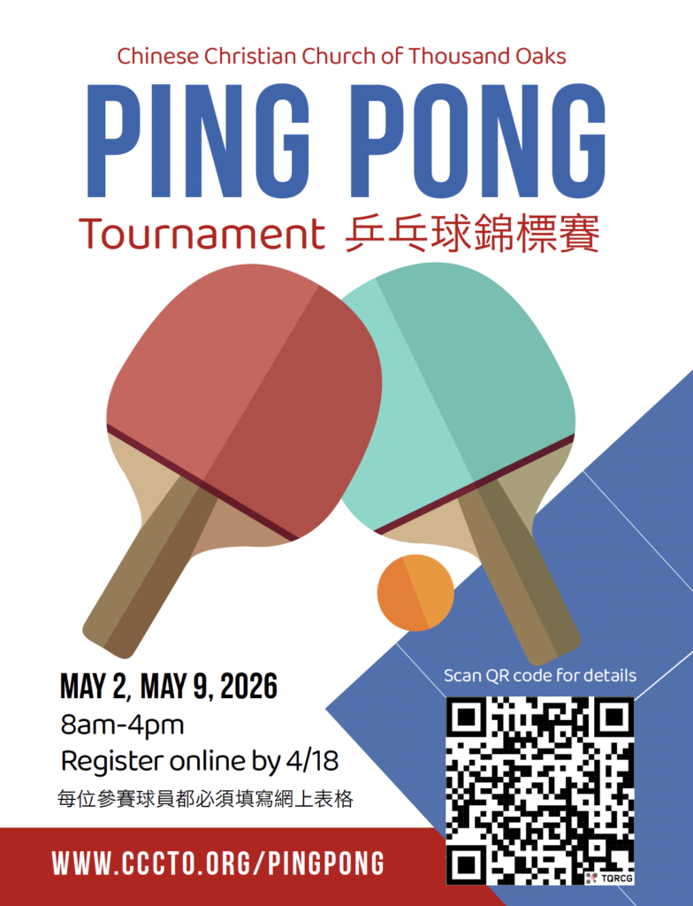 教會乒乓球錦標賽: 五月二日(週六)初級組; 五月九日(週六)高級組。請於四月十八日前網上報名。www.cccto.org/pingpong